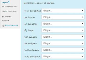 El presente artículo fue desarrollado en el marco del proyecto de investigación ‘Unidades didácticas para la enseñanza del griego clásico a estudiantes de filosofía’ de la Facultad de Filosofía y Ciencias Humanas de la Universidad de La Sabana, cuyo objetivo es la implementación de nuevas estrategias metodológicas y de tecnologías del aprendizaje y el conocimiento (tac) en el curso de Griego ii del programa de Filosofía. La necesidad de llevar a cabo dicho proyecto se debió al interés manifestado informalmente por los alumnos de estudiar lenguas clásicas de una manera más amena y motivadora, ya que los manuales para la enseñanza de estas lenguas tienden a seguir una metodología tradicional, fundamentada en la memorización de estructuras gramaticales y de listas de vocabulario y se basan en textos que poco tienen que ver con la filosofía antigua.2 La asignatura de Griego ii es el último nivel de los cursos de griego y el segundo de los cursos de lenguas clásicas, pues se dictan también dos cursos de latín. La intensidad horaria es de tres horas presenciales distribuidas en dos bloques, uno de una hora y otro de dos horas. Se espera que el estudiante invierta cuatro horas de trabajo independiente, ya que la asignatura cuenta con dos créditos. La evaluación del curso está dividida en tres cortes, el primero corresponde al 30 %, el segundo al 30 % y el tercero al 40 % de la nota final. Los estudiantes inscritos por semestre son pocos, puesto que su número oscila entre siete a doce personas. El curso se apoya en la plataforma Virtual Sabana, una versión de Moodle adaptada para uso de la Universidad de La Sabana (vid. sección 2.1.1).