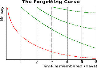 En segundo lugar, se propuso la elaboración de una wiki colaborativa en la misma plataforma, en la que cada estudiante debía, no solo elegir un término griego, definirlo y explicarlo de acuerdo con su uso en la Metafísica, sino también revisar y comentar las entradas de sus compañeros. En este punto, la participación del grupo fue crucial para la retención del vocabulario. Por último, se enlazó un curso con la aplicación SuperMemo. Se trata de un software basado en la investigación de la memoria humana a largo plazo, las repeticiones espaciadas y la curva del olvido. Este software está disponible para cualquier dispositivo móvil con o sin conexión a internet. Su utilización en la enseñanza de lenguas es beneficiosa, pues ayuda al estudiante a desarrollar la competencia lexical y así lograr que las palabras aprendidas permanezcan en la memoria. Se recomienda usar SuperMemo mínimo tres minutos diarios, de manera que, como resultado, el software desarrolle algoritmos que permitan determinar el intervalo más efectivo en el cual una palabra puede ser recordada; estas repeticiones son conocidas como repeticiones espaciadas. Además, según el grado de dificultad, se aplica el principio de la curva del olvido, el cual está relacionado con la intensidad del recuerdo. La Figura 3 representa la curva del olvido presenta cómo en unos días o semanas se olvida la mitad de lo aprendido, si no es repasado (vid. Figura 3) (Woźniak, 2018).