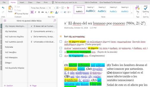 Para la lectura de la introducción a la Metafísica de Aristóteles (980a-982a) se decidió crear una sección que reunía los blocs de notas del curso, en los que las instrucciones fueron dadas total o parcialmente en griego clásico para lograr ofrecer un mayor input lingüístico a los estudiantes (vid. Figura 6). Se les sugirieron pasos que debían seguir en el análisis del texto para proponer una buena traducción, como son el iniciar con la búsqueda del verbo principal, el análisis morfológico del mismo y la identificación del sujeto y los complementos del verbo, los cuales debían resaltarse con colores distintivos. Asimismo, OneNote permite el seguimiento del proceso, puesto que el profesor puede observar, analizar y evaluar el proceso de traducción que lleva cada estudiante. De esta manera, el docente accede a las distintas pestañas de los estudiantes y la propia para hacer anotaciones, aclaraciones, correcciones, etc. Esta plataforma fue elegida porque se puede enlazar el diccionario griego Liddell-Scott-Jones (lsj) a través de Greek Word Study Tool una herramienta de Perseus Digital Project (Crane, 2018). Así, al hacer clic sobre una palabra se abre la entrada al lsj en Perseus. La presentación y organización del texto origen fue dividida en seis partes, siguiendo la propuesta por Cambiano en su artículo “The Desire to Know” (2013).15
