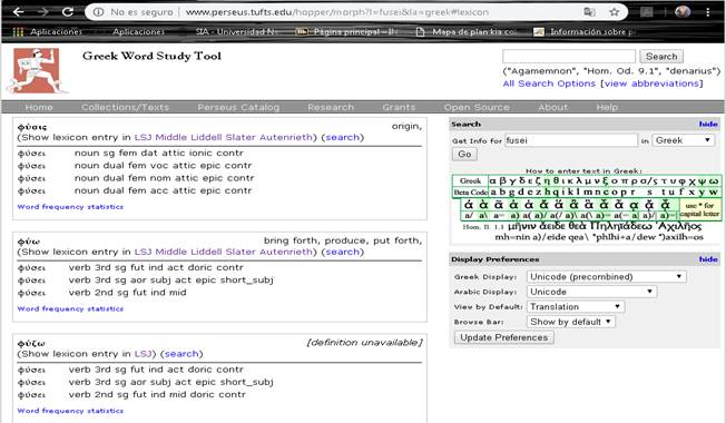 Como se mencionó, Perseus Digital Project fue uno de los recursos elegidos para la interpretación, el análisis y la traducción del texto origen. Perseus es un proyecto que ha desarrollado una biblioteca digital que reúne diferentes recursos como textos en diferentes idiomas, traducciones, vasijas, pinturas, etc. Actualmente la investigación de Perseus Digital Project se centra en el efecto que tienen las interconexiones entre textos, comentarios, gramáticas, diccionarios y otras herramientas de referencia sobre la experiencia de la lectura y la traducción (Crane, 2018). Perseus es de las pocas herramientas digitales que cuenta con el análisis lingüístico y lexical, lo cual permite y facilita la lectura de textos antiguos (vid. Figura 7). Para usar este recurso, se debe ingresar a Perseus Digital Project y dirigirse a Greek Word Study Tool. Una vez en esta página, se debe elegir la lengua que se va a trabajar e ingresar la palabra a analizar. Para griego clásico, Perseus ofrece la opción de introducir el texto con el alfabeto griego o con el alfabeto latino siguiendo una tabla de equivalencias. Como resultado de la búsqueda, se pueden conseguir uno o más resultados que incluyen el análisis morfológico de la palabra y sus posibles equivalentes en la lengua inglesa; la elección de la entrada dependerá del objetivo de estudio. Es posible profundizar en la semántica de la palabra griega dando clic sobre el diccionario Liddel-Scott-Jones (lsj). Este diccionario presenta las variedades dialectales de la palabra y los posibles significados citando brevemente pasajes de autores clásicos donde se encuentra con mayor o menor frecuencia el uso específico según el contexto.