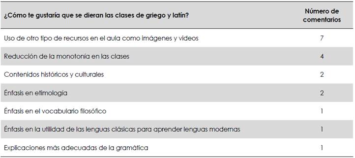 Finalmente, puede observarse cómo la opinión de los estudiantes resulta fundamental para la transformación y el mejoramiento de las clases. Las sugerencias y las recomendaciones dadas por los alumnos son valiosas y constituyen el punto de partida desde el cual el profesor debe reflexionar para modificar y actualizar su práctica pedagógica, porque la perspectiva que tienen ellos sobre el curso es diferente a la del docente y ayuda a enriquecer la planeación de actividades del curso dentro y fuera del aula. Por otra parte, la efectividad de las tac se debe a la elección y organización de los contenidos, siguiendo criterios rigurosos. El desarrollo de este tipo de unidades dedicadas a la traducción e interpretación -no solo de textos antiguos, sino de cualquier otra lengua- resulta un aporte, puesto que su impacto en la docencia y el aprendizaje es notablemente significativo.