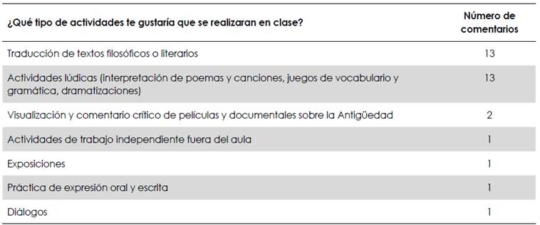 En consonancia con lo anterior, los estudiantes consideran que la metodología de la clase es monótona, pues la lectura y el análisis por turnos de las lecturas graduadas de los manuales y la preparación de ejercicios escritos no resultan motivadores ni entretenido, al tiempo que insisten en la creación de actividades lúdicas e interactivas. Asimismo, es manifiesto el deseo de traducir textos filosóficos y otro tipo de textos diferentes a los que se encuentran en el manual, pues suponemos que las lecturas les resultan poco significativas, lo cual explicaría la dificultad en la memorización del vocabulario, uno de los aspectos en los que los estudiantes presentan el rendimiento más bajo en las calificaciones.