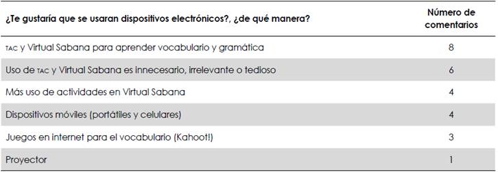 Por otra parte, el uso de tac resulta notablemente interesante, puesto que, aunque la mayoría de los aprendices considera que deben incluirse (57,14 %) en las clases, seis de ellos (42,85 %) manifestaron que son innecesarias, poco relevantes o tediosas. Este rechazo puede deberse a experiencias desafortunadas en la implementación de tac en el aula o en las plataformas como Virtual Sabana por parte de los profesores, como puede deducirse de las siguientes respuestas a la tercera pregunta: