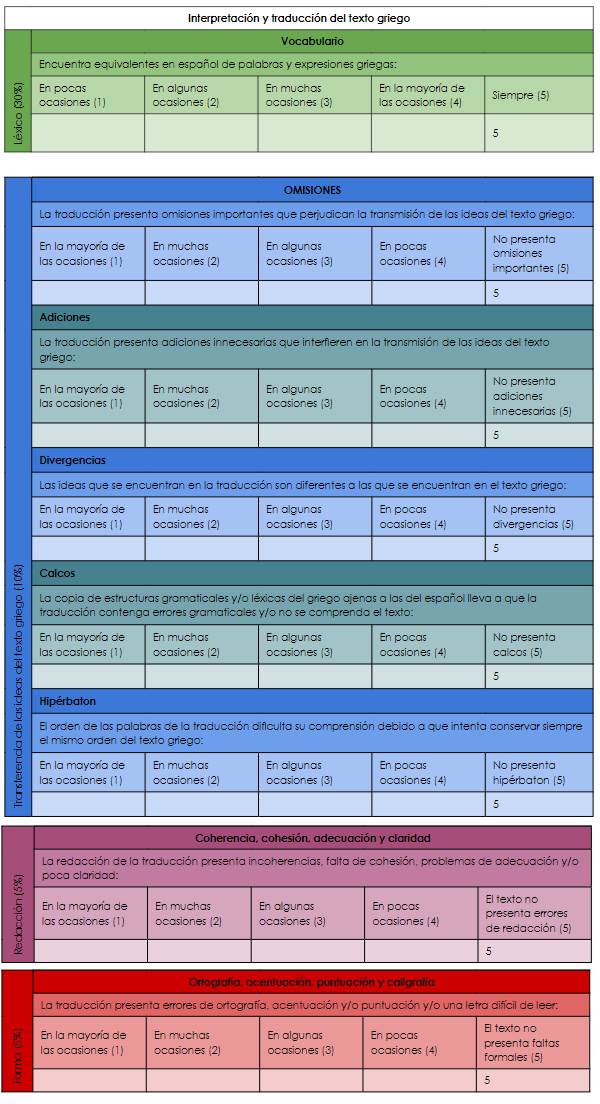 A partir de lo anterior, las competencias para desarrollar en los estudiantes serían a) la capacidad de comprender el texto griego a nivel morfosintáctico; b) la habilidad de encontrar equivalencias de conceptos y expresiones griegas en la lengua meta; y c) la destreza en la transferencia de las ideas de una lengua a otra. Para su desarrollo en el aula se tuvo en cuenta la metodología basada en el error propuesta por Hurtado (1994, 1995), en la que el diagnóstico, la autoevaluación del estudiante, el aprendizaje de los errores, la resolución de los problemas de diversas maneras dependiendo del tipo de error y la aplicación de criterios de manera progresiva son fácilmente aplicables en las clases de lenguas clásicas, puesto que los estudiantes presentan clase a clase versiones de textos griegos. Asimismo, el diseño y la presentación en clase de las rúbricas de evaluación contribuyeron a una formación más consciente y práctica del proceso de traducción (vid. sección 3).