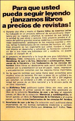 El Centro Editor de América Latina tuvo un importante papel cultural durante la dictadura4. Por un lado, garantizó la supervivencia de una tradición cultural “universal” y progresista alternativa al discurso “occidental y cristiano” de los voceros de la dictadura, que pregonaban las virtudes de la integridad nacional al tiempo que abrían el mercado a las importaciones masivas en desmedro de la industria local. Por otro, creó un espacio de producción cultural, de supervivencia material, de sociabilidad y formación para numerosos intelectuales que permanecieron en el país, excluidos de los circuitos de producción específicos, como la universidad: