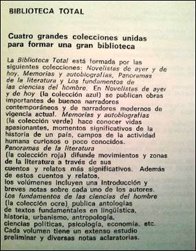 Si bien ninguna “declaración de intenciones7” encabezaba los volúmenes, algunas instancias peritextuales y epitextuales informan sobre los criterios de selección de las obras y sobre el perfil del público perseguido. Por un lado, los primeros ejemplares de la biblioteca traían un volante informativo con la leyenda “Para que usted pueda seguir leyendo ¡lanzamos libros a precios de revistas! (Figura 1). Por otro, a medida que el proyecto crecía, las últimas páginas de algunos números consignaban un anuncio cuyo lema describía la compleja estructura de la colección: “Cuatro grandes colecciones unidas para formar una gran biblioteca” (Figura 2). Ese anuncio, que solía preceder el listado de títulos ya publicados, sitúa con exactitud el período de producción de los autores y géneros seleccionados -contemporáneos y modernos “de vigencia actual”- pero no menciona el origen nacional de las obras y compilaciones editadas. Sin embargo, los “buenos narradores”, los “movimientos y zonas de la literatura” así como las “obras importantes” que la Biblioteca Total contribuyó a difundir, o a mantener en el mercado lector eran fundamentalmente de origen extranjero: el ochenta por ciento de los títulos eran traducciones. Se trató de una verdadera maquinaria importadora en la que el peso de la importación y recepción, es decir, la creación de valor para las obras en el espacio receptor, recaía sobre las distintas instancias mediadoras -directores de colección, prologuistas y traductores-. Esas traducciones venían a llenar una función cultural y política, de apertura y preservación de un espacio para la circulación de discursos que, como el de las ciencias sociales, estaban sometidos a la presión del discurso censorio y de las prácticas estatales represivas.