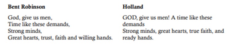 De hecho, en este poema la autora toma prestados varios versos y el tema central de un poema no firmado que apareció en 1918 en el periódico adventista Eastern Canadian Messenger bajo el título de Give Us Men!. Cabe anotar que el texto de la publicación canadiense retoma el motivo conductor del poema Wanted, escrito por el poeta americano Josiah Gilbert Holland y publicado en su colección de poemas The Marble Profecy and Other Poems (1872). Aunque ambos poemas son diferentes, su coincidencia temática, -sobre todo en la frase “give us men” que en el poema de Holland se dirige directamente a Dios “God, give us men” contrario al poema de 1918 pero que en éste último se convierte en una anáfora a lo largo del texto-, creó una intrigante confusión que hace que algunos le hayan atribuido el texto de la publicación adventista a Holland o incluso hayan mezclado ambas versiones7. Esta confusión explicaría que en el texto de Bent Robinson dialoguen ambas versiones ya que la autora sanandresana también tomó prestados algunos versos del poema Wanted, muy popular en su versión original en la cultura americana a pesar de que el autor ya no sea casi leído en ese país. Por ejemplo, al inicio de su poema, Bent Robinson (2013, p. 532) reproduce prácticamente el inicio del poema de Holland (1872, p. 89):