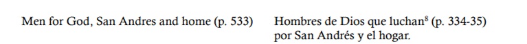 Por otro lado, la versión española enfatiza más el aspecto local y nativo que resulta tan significativo para el raizal. Uno de los modelos bíblicos mencionados es el profeta Daniel que en la versión inglesa representa al hombre que ora, “Men, who pray like Daniel” (p. 532), mientras que, en la española, Daniel es el que cree en la tradición: “Hombres que crean en el pasado como lo hacía Daniel” (p. 534). Esta re-creación está en consonancia con otros puntos vertebrales de la versión española: la ya mencionada “tierra nativa” que en la versión inglesa aparece como “homeland” y la elección de “ancestros”: “[hombres que] se aferran a los estandartes de sus ancestros” que en inglés figura como “fathers”: “[men who] grasps [sic]9 the standards of their fathers”. De esta manera, en la versión española, la autora toma posición frente a este verso, prestado directamente del poema adventista, al utilizar “ancestros”, noción que, aunque está dentro del espectro semántico de la palabra “fathers”, está más distante de ésta que de otras nociones del inglés como el cognado “ancestor” o incluso “forefathers”.