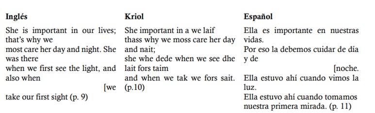 Esta abigarrada mezcla de registros, lenguas y variantes que socavan el código estándar desde el interior, no puede ser ya considerada una lengua mayoritaria. En ese sentido, tal vez la relación entre el inglés y el kriol tendría que ser considerada simétrica por la solidaridad que entre estas lenguas existe. La relación asimétrica se daría en la traducción de este inglés heterogéneo al español, lengua que en América Latina ocupa una posición hegemónica.