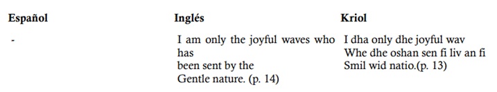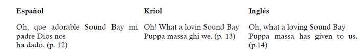 Esto muestra una vez más el vínculo que hay entre el kriol y el inglés caribeño. Cabe anotar, sin embargo, que en los otros cuatro poemas en los que hay una referencia a Dios, el autor optó por otras alternativas en español y en inglés: en The Ideal Father/Dhe Ideal Pupa14/El padre ideal, aparecen respectivamente: Señor y Lord lo mismo que en La pequeña canción de mamá/Mi Muma Liccl Sang/My Mother’s Little Song mientras que en Memories of Peace/Memorias de Paz/Memorys af Peis, figuran Cristo y Christ y en Bind us to thee lord/Únanos15a ti Señor/Bind us to yu Lard, tenemos Dios y God.