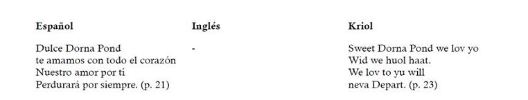 En este retrato espontáneo y tierno de la comunidad que vive alrededor del humedal de Dorna Pond, al sureste de la isla, podemos ver nuevamente que la apuesta a la rima en kriol contrasta con un estilo libre, incluso conversacional, en español. Se resalta también el préstamo en español y en inglés de la palabra cricker o criker, proveniente del kriol y que, según el autor13, se usa para referirse a quienes viven cerca de un pequeño puente, que ellos llaman crik, construido sobre un arroyo que había en la zona y que se desbordaba cuando llovía mucho.