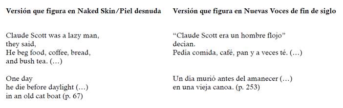 Por otro lado, al enfrentarse dos versiones dirigidas a audiencias diferentes, se encuentran elementos culturales que se mantienen en tensión. En el poema, The Poor Old Man, dos símbolos culturales de la versión en inglés caribeño, los conceptos de “bush tea” y “cat boat”, se enfrentan a los conceptos “té” y “canoa” en la versión española que aparece en la antología Nuevas voces de fin de siglo: