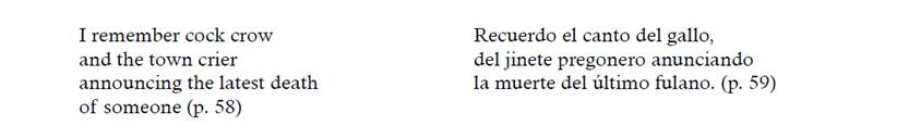 Los cambios generados por la re-espacialización del texto también están presentes en la semiautotraducción. En la versión española de Cock Crow/El canto del gallo (Ramírez Dawkins, 1996) traductor y autor en su función de intermediarios culturales, optaron por precisar el sentido del “town crier” que inmediatamente trae a la mente de la audiencia local a un jinete, pues antiguamente los pregoneros de la isla andaban a caballo. Como esta imagen cultural es invisible para los continentales, que visualizan al pregonero de pueblo de otras maneras, el autor y el traductor insertaron el sustantivo “jinete” para hacer que la audiencia continental visualice al pregonero como lo visualiza la audiencia local, a pesar de que el sentido de estrofa sea ligeramente diferente con respecto a la versión inglesa: