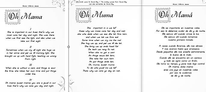 Williams Jessie busca restituir en sus textos el tono de la oralidad, tan importante para su cultura. Es de anotar la diferencia rítmica que hay entre las versiones en inglés y en kriol y la versión española. La correspondencia de sonidos en las dos primeras, que no es sistemática como en esquemas de rima tradicionales, pero sí frecuente, se conjuga en una musicalidad muy característica. En cambio, la versión española constituye un contrapeso a esta regularidad métrica. La versión española reproduce formas y estructuras de un discurso más directo, tal como se puede ver en este extracto del poema titulado Oh Mama/Oh Muma/Oh Mamá, en el que la apuesta a la rima del diptongo /ai/ en inglés y en kriol, desaparece en la versión española, cuya estrategia consiste en evocar el patrón de un evento comunicativo cotidiano, es decir, de una producción oral espontánea y en la que no se busca deliberadamente hacer rimar las palabras.11: