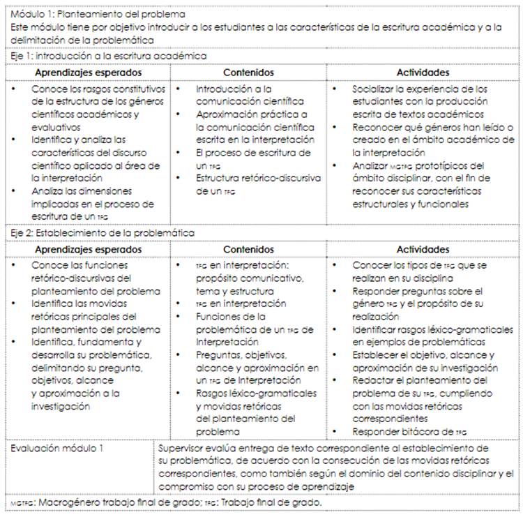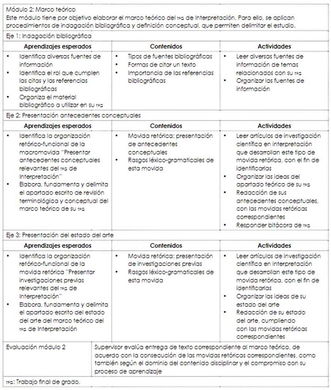 La SD se sustenta en el modelo retórico-discursivo del TFG de Interpretación y se adscribe a un enfoque procesual. Por lo anterior, los momentos del proceso de escritura se integraron a ejes temáticos específicos, que fomentan el desarrollo de habilidades de escritura orientadas al cumplimiento de los propósitos comunicativos de las movidas y macromovidas retóricas del modelo. Además, la SD incluye sugerencias y recomendaciones para el docente guía del TFG.