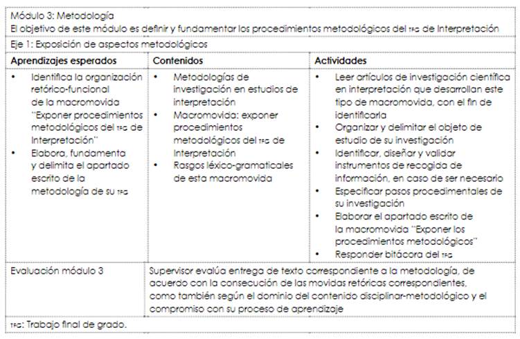 En su formación, los estudiantes tienen tres cursos relacionados con el desarrollo de su TFG: “Metodología de la investigación en traducción e interpretación”, “Seminario de graduación” y “Taller de titulación”, desarrollados en el séptimo, octavo y noveno semestre respectivamente, los tres últimos del programa de estudios. El primero se centra en el estudio de las líneas de investigación del campo y en el desarrollo de la propuesta de idea de investigación. El proceso de escritura de los TFG comienza formalmente en los dos últimos semestres del programa.
