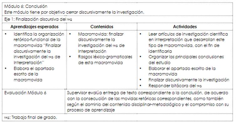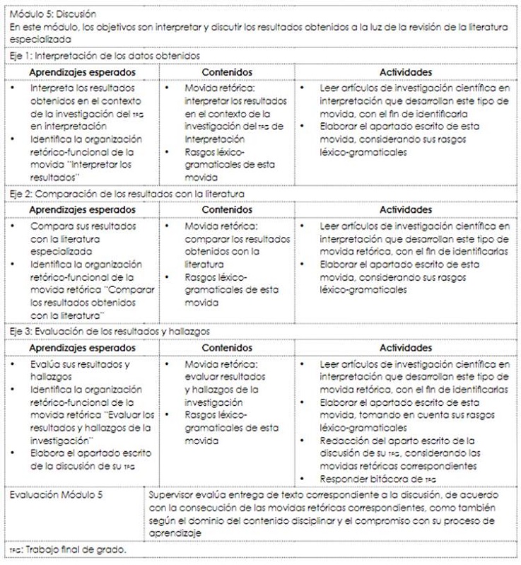 El enfoque de la pedagogía basada en el género discursivo (véase Figura 1) propone que, inicialmente, se explore el contexto. Para ello, la presente investigación se enmarcó en el programa de formación de intérpretes de la PUCV y su TFG como medio acreditativo de la competencia investigativa declarada en el perfil de egreso del programa (PUCV, 2022). Tras la aplicación del modelo retórico discursivo de Venegas et al. (2016) a un total de 63 TFG de Interpretación, se estableció el modelo de este género para la comunidad. Finalmente, y siguiendo la metodología de la pedagogía basada en el género, este estudio confluye en la producción del TFG de Interpretación, lo que se traduce en la elaboración de una propuesta didáctica que articula aprendizajes esperados, los que responden, a su vez, a los propósitos comunicativos del modelo establecido.