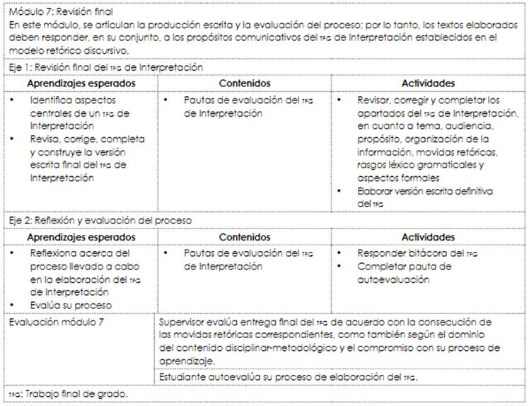 La revisión anterior evidencia que, en este primer momento de la investigación, el TFG no es una producción aislada y que los estudiantes cuentan con un trabajo previo que posibilita el desarrollo de este trabajo final. Sin embargo, la exploración del contexto hace evidente la ausencia de un modelo de TFG para la disciplina y de una SD que se haga cargo de las particularidades del modelo.