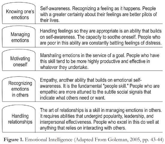 The term emotional intelligence was first proposed by Salovey and Mayer (1990). However, it was popularized by Goleman’s book Emotional intelligence (1995). Emotional intelligence consists in the skills shown in Figure 1.