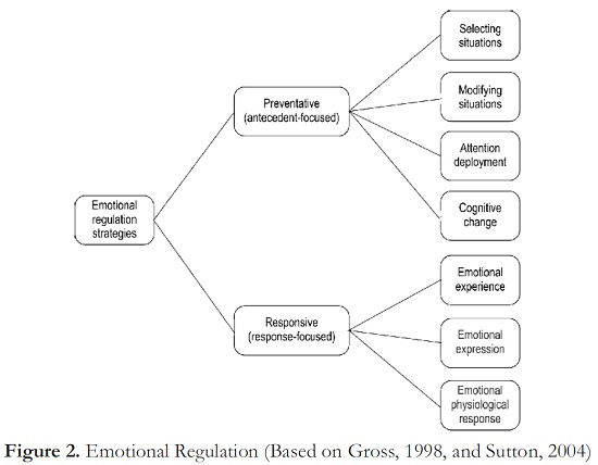 Emotional regulation also has to do with the way we express our emotions. A teacher may want to shout for joy when a child understands a rule or a concept that has been difficult for him/her, but instead, the teacher says “good job” or “well done.” In the same way, a teacher who is angry at one child may want to shout, but instead s/he may just call the child’s attention. Gross (1998) classified the strategies of emotional regulation into two main categories, preventative (antecedent-focused) and responsive (response-focused) as shown in Figure 2.