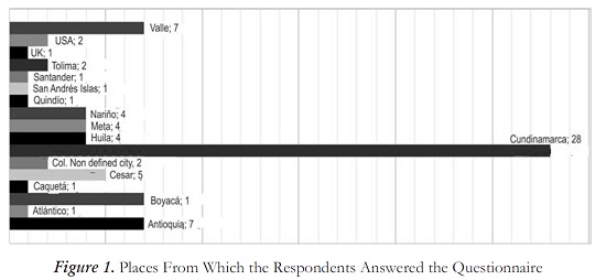 All the 78 respondents were active members of the association by the time they answered the questionnaire. Fifty-five of them were older than 36 years old while 23 ranged in age from 20 to 35 years old. These members filled out the questionnaire from different towns in the country, being towns in the Departments of Cundinamarca (with 28 respondents), Antioquia, Boyacá, and Valle (with seven respondents each) the ones with more participants. We highlight the fact that there were respondents from ten other Departments around Colombia, even from the USA and the UK. This fact indicates that ASOCOPI has had some type of presence in these places (see Figure 1).