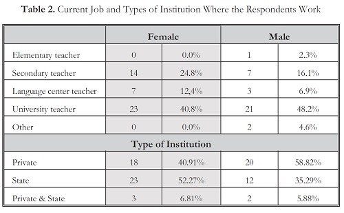 With respect to their current job (see Table 2), 14 of the female respondents work as school teachers, all at the secondary level, 23 as university teachers, and seven at language centers. Only eight of the male respondents are schoolteachers (seven at secondary level and 1 at the elementary level); 23 are university teachers, and three are at language centers. Then, percentages indicate that 58.9% of the respondents work as teachers at university level, 28.2% at schools, and 12.8% at language centers. The types of institutions where they work are both private and public, 53.26% and 46.74% respectively.