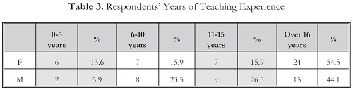 The participants are well-experienced language teachers: 50% have over 16 years of teaching experience, 20.5% from 11 to 15 years, and 29.4% less than 10 years (see Table 3).