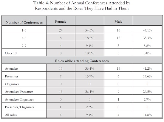 The final issue about the characterization of ASOCOPI’s affiliates is about the role they had had in the number of Association’s academic events, and its annual conferences or workshops attended (see Table 4). Eleven of them have attended over 10 conferences, 40 from one to three, and 27 between four and nine. Affiliates’ roles in these events can be as attendees, presenters or, organizers. None of the respondents have been only an organizer, but they have been only attendees (30 of them) or presenters (13 of them), and 25 have been both. Ten of the respondents have had the three roles in either of the events.