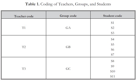 This study took place in a Colombian private university. It was applied to a group of 10th semester students studying in a bachelor in bilingual education program. The participants were 11 students divided into three groups; they had already finished all their English courses and were in the process of editing their final research reports they were asked to present in order to graduate. The participants in the study were coded as shown in Table 1.