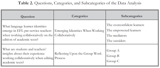 Along the different observations we made during our students’ editing process, we noticed three areas that caught our attention. The first aspect was related to the way students worked as part of a group in order to edit their manuscripts; the second aspect was the way the editing process was developed in groups; and the third one was related to students’ identities as members of a team. Taking these observations as a starting point, we decided to work on four main constructs: collaborative work and collaborative writing, which gave us insight about the process that a group would carry out as editor of a single text; academic writing, which is relevant since students were expected to follow the standards of writing an academic text, so they would require a supportive academic community to receive feedback; and the relation between identities and language learning, which would inform us about the positioning process of students inside an academic group as a social community.