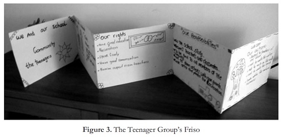 Cycle 2 was divided into four sessions. When reading the world, students shared their ideas and gave examples of communities, and compared their ideas with a definition given by the teacher to propose a new definition. In the second moment, learning about the world, the students had the opportunity to learn about the school community through an interview. Each group selected the person that they were going to interview, and the students designed the questions and the guidelines for the interview. Each group shared the information collected with the rest of the class through a jigsaw activity.2 Then, students came back to their original groups and used the information gathered to talk about the school community members and their work places. In the third moment, changing our world, they reflected upon their own and others’ rights and responsibilities at school and how they could contribute to the school. They listed some students’ rights and responsibilities and then compared them with the ones written in the School Handbook. As a final product of this cycle the students made a friso that included the summary of the reflective work developed in the different sessions about their roles, rights, responsibilities in the school, and their actions to contribute to the school community. Each group was encouraged to explain its friso to the whole class using the foreign language (see Figure 3).