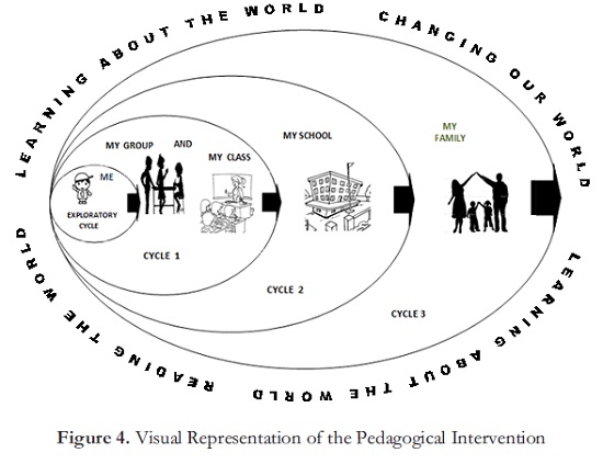 The implementation of a critical and dialogical perspective in the EFL classroom generated changes in the teaching and learning practices. As a result of this pedagogical experience, there was a gradual process that moved students to a broader sphere of their realities in each cycle. This let them explore and reflect on their worlds and, at the same time, use the foreign language to do so. Figure 4 has been designed to show a visual representation of the intervention. Since each cycle was developed in three moments, these encapsulated the whole process that started with the exploratory cycle. This cycle is represented in the smallest oval, here, and individual recognition of the student as a person and as part of the group of students was encouraged. Then, in Cycle 1, the students fostered group and class work and established a better relationship with their teams and classmates. Cycle 2 moved students to a wider context which was the school. They could go beyond the classroom; they knew the school community and recognized themselves as part of it. Finally, in Cycle 3 students had the opportunity to know their family members better, reflect upon their family relationships, and propose actions to improve those relations, thus going beyond the school context.