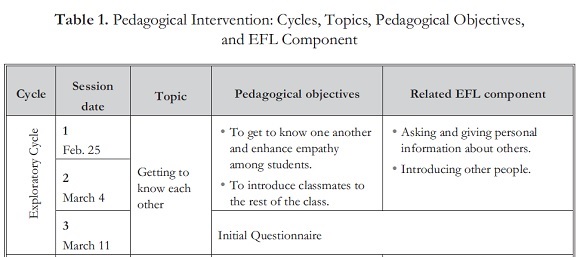 The purpose thus, was to provide opportunities for students to know, understand, and transform their reality and develop social skills while using the foreign language to express themselves. Table2 shows a summary of the pedagogical intervention, including the cycles, the number of sessions and dates, the topics students developed through group work, the pedagogical objectives, and the EFL component developed in each session which is expressed in terms of communicative functions of language.