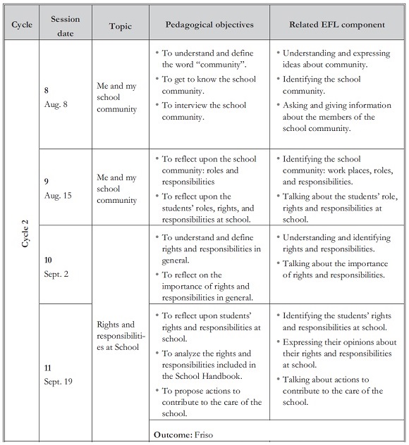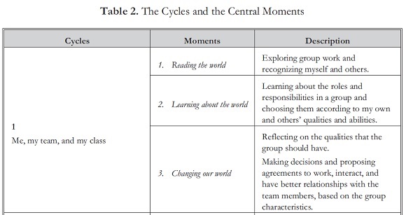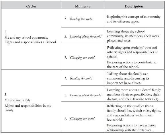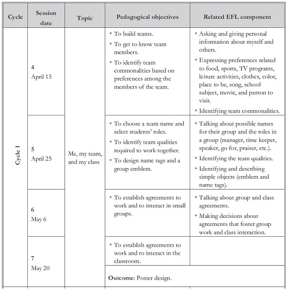 The topics in Cycle 1 were me, my team, and my class. In Cycle 2, the main topics were: me and my school community and rights and responsibilities at school; and in Cycle 3, the topics were: me and my family, and rights and responsibilities in my family. These topics were chosen keeping in mind that, according to the critical pedagogy perspective, it is necessary to relate whatever students learn to their world and the realities of their world. These were articulated with pedagogical objectives that aimed at fostering group work, cooperative learning and social skills while encouraging students to use the foreign language to share and construct meaning.