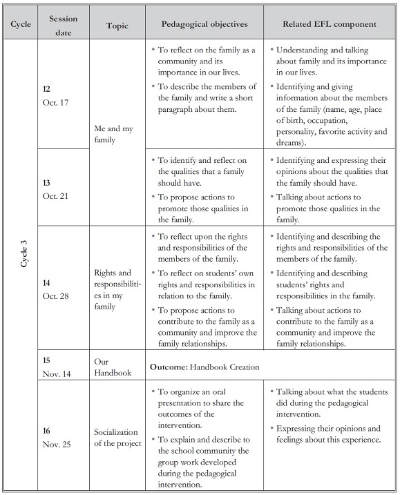Cycle 3 was developed in five sessions. In the first moment, the students and the teacher talked about the family as a community; we then discussed its importance in our lives. In the second moment, the students interviewed their families, made a family tree, and wrote short paragraphs with the information collected. Then, in the third stage, they reflected on the qualities that a family should have, their roles, rights, and responsibilities within their household, and the students proposed actions to have a better relationship with their relatives. The students had the opportunity to use the foreign language to describe and share the information collected about their families, express their ideas about their rights, responsibilities, and planned actions.