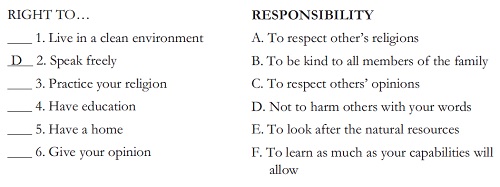 2. Match the rights in the first column with the responsibilities in the second column. Write the letter from each RESPONSIBILITY next to the number of the corresponding RIGHT.