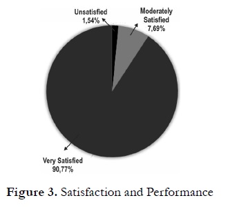 The first step to conduct the analysis was to transform the answers into a continuous variable. The different answer options had a higher or lower value according to the degree of agreement regarding the 32 statements: 5 (totally agree), 4 (agree), 3 (neither agree, nor disagree), 2 (disagree), 1 (totally disagree). This led to establish a theoretical mean and cut-off points for the categories. This was the basis for re-coding the average of each participant’s answers for a particular category in one of these satisfaction levels: (1) unsatisfied, (2) moderately satisfied, (3) very satisfied. The answers provided by the surveyed students show that there is an overall positive assessment in the way foreign language courses are currently administered and are summarized Figures 1 to 6.