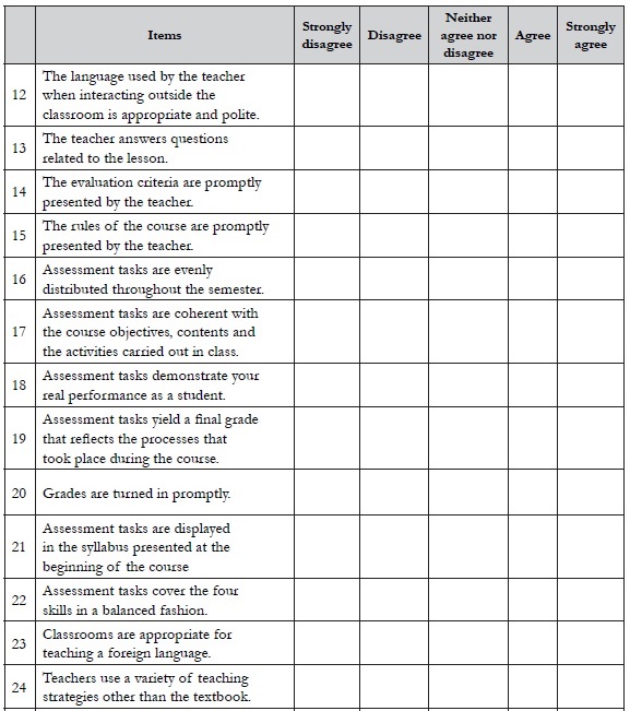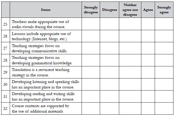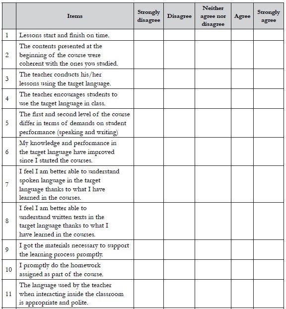 The instrument had 32 Likert-type questions related to satisfaction in six dimensions: the course, student performance, teacher-student interaction, assessment practices, facilities and resources, methodology; and one open-ended question aimed at collecting suggestions about the courses (see Appendix). The items were designed by three foreign language teachers and a psychologist, which ensures a valid measure of how satisfied learners are with L2 courses. The reliability level was high (α = 0.92). The questions were written in Spanish in order to avoid ambiguity or misunderstandings.