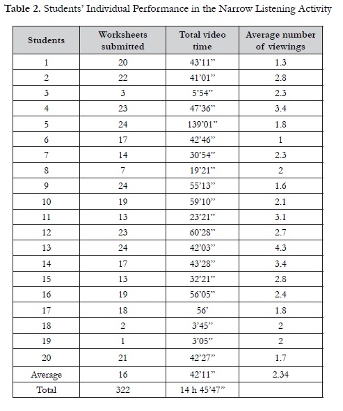 When looking at performance individually, the diversity of the work done by the students along the semester became evident. This information is summarized in Table 2. By freely choosing videos, most students were exposed to over 40 additional minutes of English. Most students generally watched the videos more than once, thus increasing the time of exposure. The student labelled as “5” in Table 2 selected longer videos to manage completion of 139 minutes (over two hours). On the other extreme, many students did not complete the minimum of required worksheets thereby getting very little exposure. The most notable cases in this trend were students labelled as “3, 8, 18, and 19”.