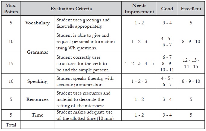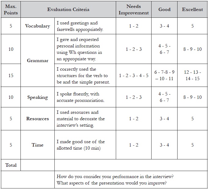 Instructions: The activity will be done in pairs. One member will assume the role of presenter and the other the role of celebrity; then roles will be exchanged. Both will produce a questionnaire with open questions about personal information, tastes, and preferences. They will also prepare material to decorate the space where the interview will take place. Finally, it is recommended to practice the interview as often as necessary, taking into account the established criteria.