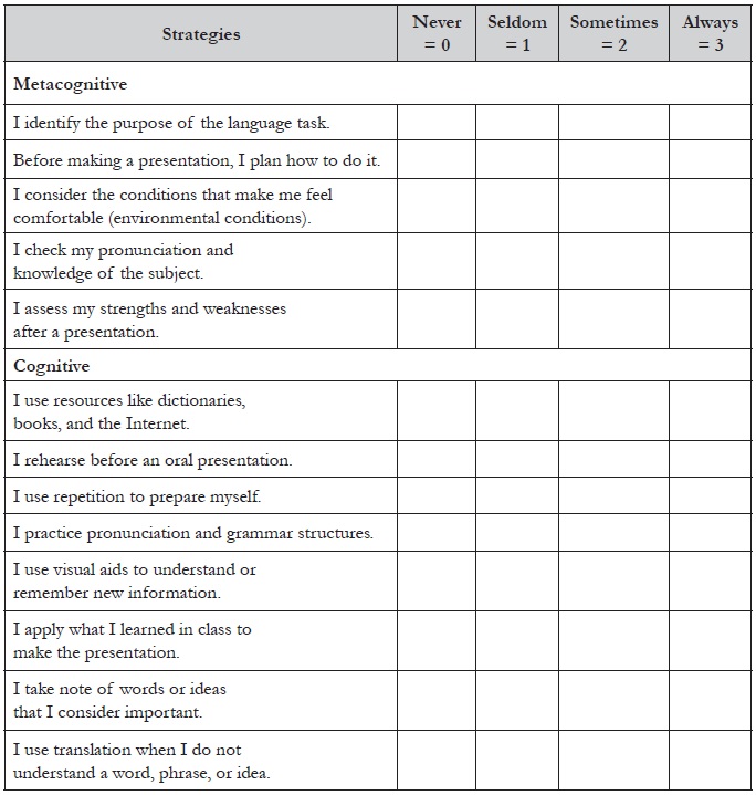 The strategies instruction workshop was developed in two of the semillero sessions. In the first one, students were trained in metacognitive strategies and in the second one, in cognitive strategies. In each session, we supplied a working definition of the strategies and generated a reflection upon their use and importance through a problem-solving activity in which the participants had to advise a person how to prepare for an oral presentation by suggesting learning strategies. Afterwards, the strategies-based feedback was delivered to each participant in a form (Appendix 4) that included strengths, weaknesses, and suggestions as to the use of specific strategies for improving their preparation and oral performance for the post test.