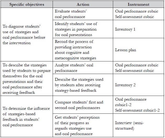 In the second stage, students received direct instruction on cognitive and metacognitive strategies (the intervention is described in detail in the section below). Later, teachers used a form (Appendix 4) through which they delivered feedback to students that included suggestions as to using specific strategies to prepare for the next oral presentation. In addition, a second oral presentation was assigned to assess whether the strategies-based feedback had had an influence on students’ preparation and oral performance. For these purposes, a second set of performance and self-assessment rubrics was applied and students answered a second inventory. Finally, to determine the influence of strategies-based feedback on students’ oral performance, all the students and one parent were interviewed. Also, a comparison was made between the first and the second oral performance rubrics and between the inventories that students completed before and after the intervention. Table 1 summarizes the actions taken and the instruments used for data collection.