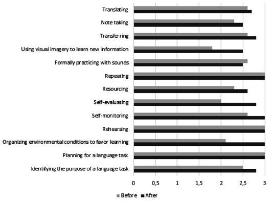 In order to diagnose the strategies used by students, we compared the answers from the first and the second inventories. These were answered by the eight participants. Figure 1 shows the average use of strategies before and after providing the instruction and the strategies-based feedback. The first seven strategies represent the cognitive strategies, and the other six, the metacognitive strategies. Each strategy is represented with two bars which show the use made by students before and after the intervention.