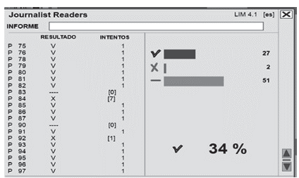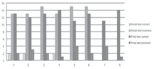 The graphic of the initial and final tests provides a picture of the significant difference between the results that the students obtained before and after the implementation of the VLO. This shows that the students could have taken advantage of the use of reading strategies when dealing with newspaper articles in ESP. Consequently, the participants showed an overall increase in the outcome in reading comprehension. Regarding the objectives of the test, these results suggest that the students, over time, become more equipped with the linguistic competences they need in their professional life as social communication or journalism students.