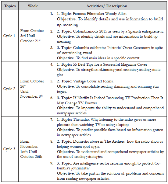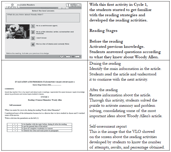 Cycle 1 contained three simple short newspaper articles about cinema directors and entertainment; the students needed to identify details and build up meaning. Cycle 2 contained topics about magazines and Netflix productions. Finally, Cycle 3 included articles about the role of the radio and the importance of protecting journalists in Colombia. Hence, after participating in the previous two cycles, the students could take part in the solution to problems presented in the articles. Finally, final tests were designed to check students' reading comprehension of the topics and the use of the reading strategies suggested in the VLO.