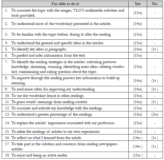 The participants also strengthened their knowledge and the strategies necessary to tackle academic and scientific texts. They were able to recall and identify reading strategies in the self-assessment checklists of each report of the VLO reading cycle. The evidence gathered from the reports in the Moodle platform of the course consisted of the participants' self-assessment and the work done in the three cycles monitored by the teacher. The participants coped with the difficulties found in terms of the appropriation of the concepts and resources presented in writings. Consequently, this enhanced their linguistic repertoire for coping with articles and reports on social communication and journalism. This assertion derives from the contrast of the students' responses in the interviews, questionnaires, and reports at the beginning and at the end of the implementation.