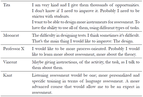 As Table 3 shows, all five teachers wished to improve different aspects in language assessment. Specifically, design of instruments was apparent in Tita and Mooncat; general approaches for assessment can be inferred from the answers given by Professor X and Kant; and specific details about the teaching-assessment relationship emerge in Vincent’s answer. In conclusion, the answers imply the need for general, differentiated training for language assessment among these teachers.