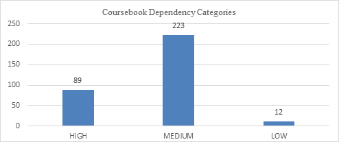The majority of the participants, making up the largest group in the study, were identified as medium dependent on coursebooks. They constitute more than half of the participants and this parallels with the findings of a survey conducted by the British Council in 2008 as suggested by Tomlinson (2012). This survey indicated that 65% of the teachers often used coursebooks to aid their teaching practices while 6% never used a coursebook, which is twice as many as the percentile that accounts for the number of teachers who rarely depend on their coursebooks in this current study. In the present study, teachers who highly depend on coursebooks comprise slightly more than a quarter of the participants. This is supported by the findings of the same survey by the British Council which revealed 26% of the respondents used coursebooks every day (Arkian, 2008). Arkian (2008) gives some further details about the survey such as the number of participants (N = 310) and the items of the survey; they are all very similar in terms of characteristics of this study yielding very similar results.
