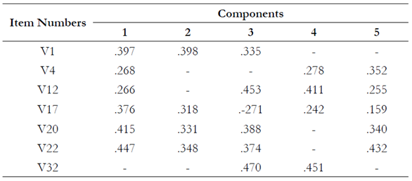 The next step was to find out the factors underlying the variables in the scale. As a result of the principal component analysis, the table in which the total variance was explained indicated five factors or components. After the number of factors was revealed, factor loads were examined to check if they had high loadings for more than one factor to the same extent. For this reason, the rotated component matrix was analyzed in detail to detect any items loading more than one factor. These complex items and the factors they load can be closely examined in the table below.
