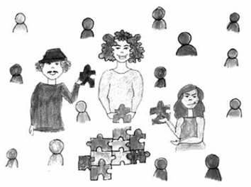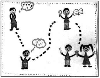 The idea of working together and building on each other's ideas was also evident in the students’ artwork. We saw a common theme associated with problem solving and finding solutions (see Figures 3 and 4 below). As Figure 3 showed, there was a person with a question who sought a solution. After searching for the answer, and with the help of someone, he found the tools to solve the problem. In Figure 4, different kinds of people were working to put the pieces of the puzzle together.